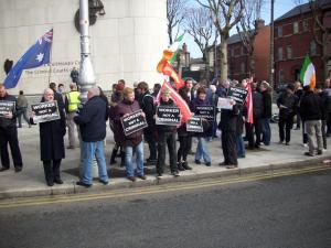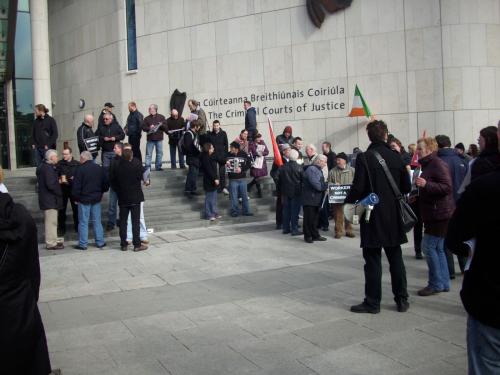 Around 100 people demonstrated at the “Courts of Justice” in Parkgate St. in Dublin this morning (16/3/11) in support of Gerard McDonnell, who is facing charges in relation to a “floating picket” in Dublin port in 2009 during the drawn out strike at MRL. The case was adjourned until April 1st as the book of evidence was not ready, despite, as the defence solicitor pointed out, over 18 months having elapsed since the alleged offences.