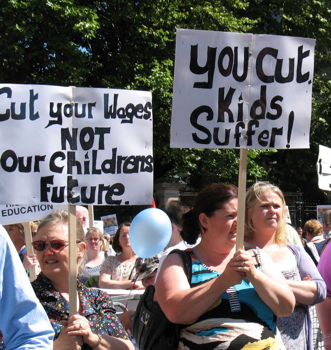 Hundreds of parents, children, teachers, political representatives and people from communities all over the country gathered outside the Dáil on Wednesday to express their anger and dismay at the government’s plan to cut Special Needs Assistants and Resource teachers. It was possibly the finest day of this patchy summer, and as one father of a young man with Down syndrome put it, we should be at the beach instead of protesting outside the house of elected representatives. He went on to say that his young boy would not be the great young man he is at 17 without the help and dedication of the Special Needs Assistants who’ve worked with him since he started his education.