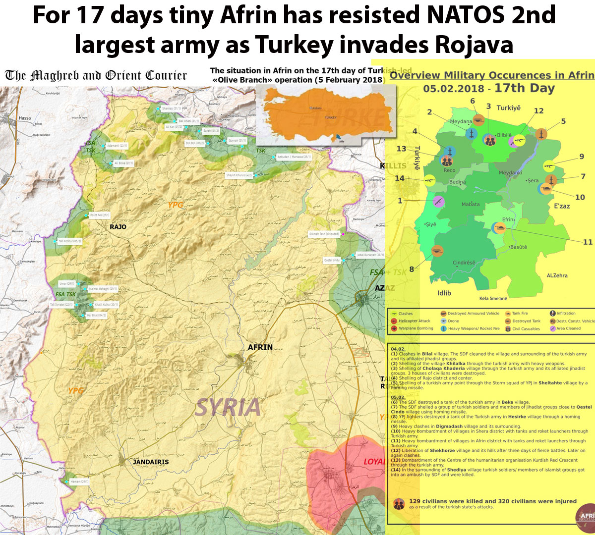 The Turkish invasion of revolutionary Rojava has now entered its 17th day. NATO’s 2nd largest army has failed to achieve any significant breakthrough against the defenders of Afrin despite deploying some of the most advanced tanks, helicopters, artillery and jet bombers. On our graphic the small map at top centre shows Turkey in orange, the tiny blue area under Turkey is the canton of Afrin, the target of this invasion and one of the 3 original cantons of the Rojava revolution. These cantons are where the experiment in direct democracy, gender equality, and sustainability began in 2012 in the most impossible conditions of the Syrian civil war and the ISIS invasion of two of the cantons.