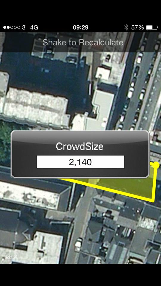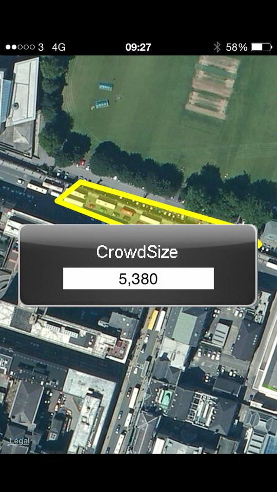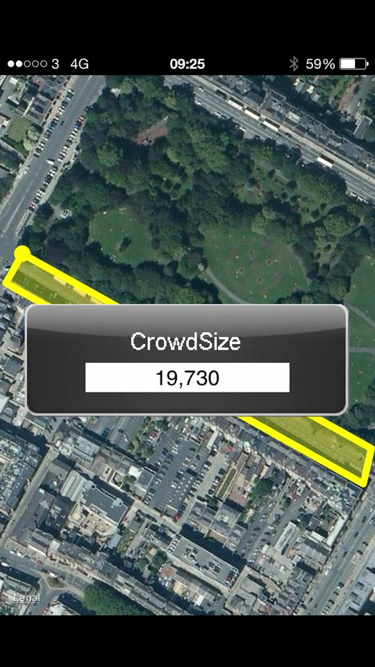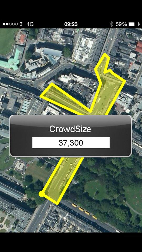 As you can see from the photo below, CrowdSize estimates that just over 19,000 people can fit in that area. I was on that side distributing leaflets for about twenty minutes at the start of the demo, and as I was leaving to move over to the other side, it was almost full, with more local groups still marching in. I went ahead and ran the app for all the areas I covered on foot during the day and only what I could actually see with the naked eye. Later I believe, there were people on the other sides of Merrion Sq and inside it. Because I didn't see the volume I've left them out. I also don't know how far Westland Row the crowd went so it stops short at my field of vision.