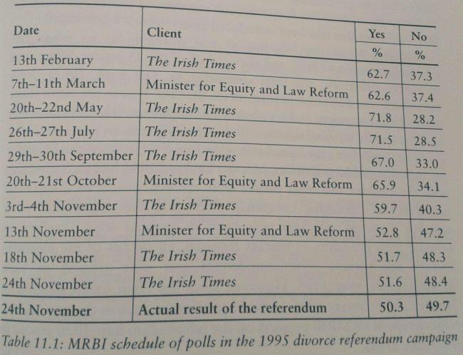 The 1995 Divorce polls showing the collapse of the Yes vote. Note that the Irish Times poll 6 days out and the exit poll are highly accurate suggesting the earlier polls probably also were and the collapse in Yes was real.