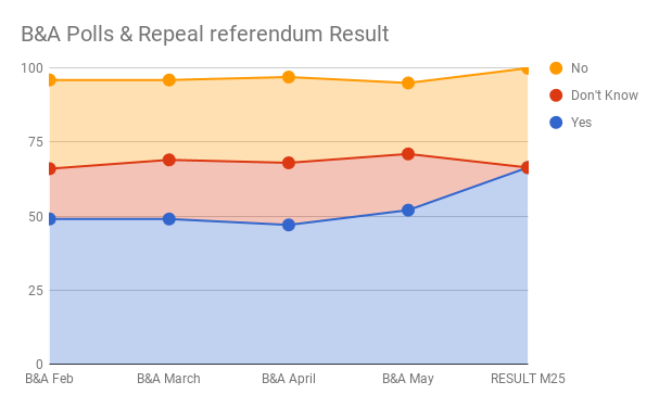 In the closing two weeks of the Divorce referendum it appears that almost all the Don’t Know’s and soft Yes voters opted to either vote No or stay at home. If the same happened with Repeal we’d have lost or have had the narrowest of victories.