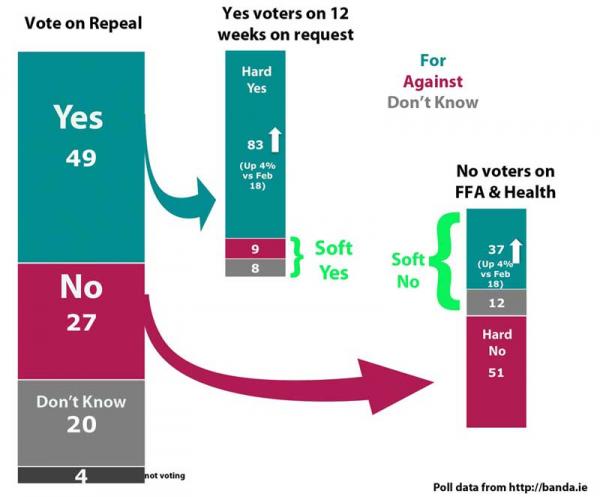 More people were willing to support this second case than were also willing to support the first case but the promised legislation would deliver abortion access for both cases. So we could say that the Hard Yes voters were those who answered Yes to abortion access in both cases while the Hard No voters were those who answered No in both cases. Both these groups were unlikely to be swayed in the campaign. On the other hand there were people who wanted abortion access in one case but not the other, these soft Yes/No voters and the Don’t Know voters were the people whose mind could very well change over the course of the campaign.