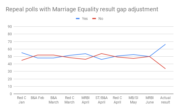 How the Repeal polls looked when you applied the adjustment for the reduction in the Yes vote in Marriage Equality polls