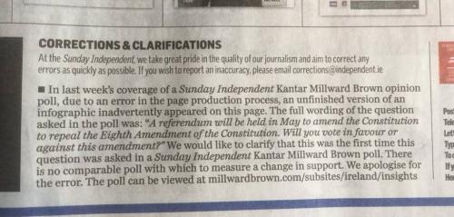 No campaigners online were looking for and then talking up any apparent reduction in the Yes vote as the start of the collapse seen in the other two referenda. There was even a very grim moment when it looked like they had succeeded. In the first week of May the Sunday Independent incorrectly presented a comparison between an opinion poll asking people how they would vote with their February poll asking if there should be a referendum. This was presented as a large drop, 18%, in the Yes vote and came at the point where those of us aware of the previous Divorce and Marriage Equality drops were worried we’d see the start of just such a decline. A drop of sufficient size in fact to make defeat likely, and certain if it represented a trend that would continue. There were a glum few days until the Independent printed a completely inadequate correction buried inside the paper in print far smaller than the original graphic.