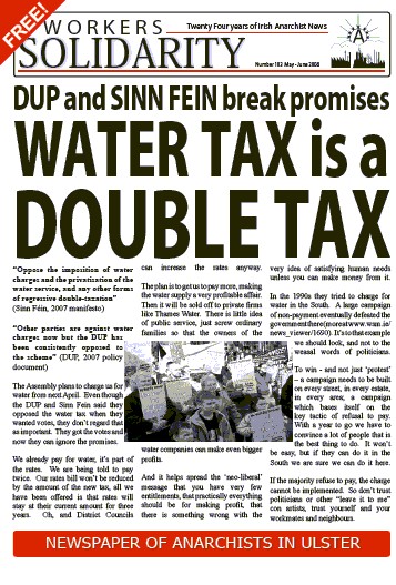 The Northern Assembly plans to charge for water from next April. We already pay for water, it’s part of the rates. We are being told to pay twice. Our rates bill won’t be reduced by the amount of the new tax, all we have been offered is that rates will stay at their current amount for three years. Oh, and District Councils can increase the rates anyway. The plan is to get us to pay more, making the water supply a very profitable affair. Then it will be sold off to private firms like Thames Water. There is little idea of public service, just screw ordinary families so that the owners of the water companies can make even bigger profits.