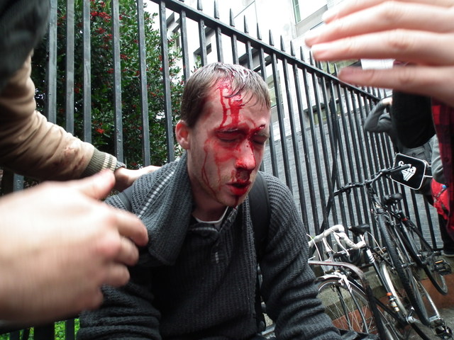 "I witnessed masked men in padded clothing beat a woman around the head with a baton. She was so scared she couldn’t move even as they shouted at her to do so. My friends and I helped her away from where the police where hitting people. The police refused to listen to our calls for medical attention and instead pushed me on top of this woman using a large plastic shield. This was only one of many instances of brutality. I also saw police punch, kick, drag and throw to the ground the people who occupied the Department of Finance.[1]. It was clear to everyone that the police decided to intimidate and physically assault us. The low number of arrests compared to the very high level of injuries suggest that this was a tactic decided at a high level. It was as if the police wanted to provoke a violent response from us. All we could do was try to defend our selves and each other from these thugs.” [2]