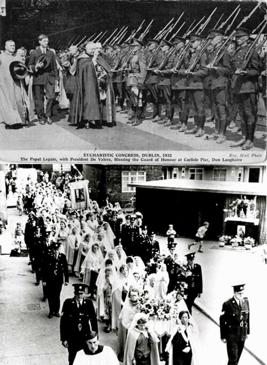 The first is one of many scenes from the 1932 Eucharistic Congress, a few short years after the Tuam home went into operation. The congress saw the Irish state lay on an enormous pageant to cement its relationship with the church as part of the process of recasting its control over the population through the promotion of a regressive religious ideology that marginalised independent women, queers and anyone else who didn't toe the line.