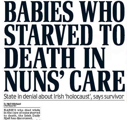 It is emerging that thousands of children were starved to death in state funded homes run by nuns in Ireland. The Daily Mail today carries a detailed report which quotes Philip Redmond, a survivor of Sean Ross Abbey Hospital, Roscrea, Co. Tipperary where of the 167 babies born in 1942, there were 72 deaths. Mr Redmond says "As far as Bessborough is concerned, there is little doubt in our minds that as many as 2,000 died while we believe another 1,200 died in Sean Ross Abbey" This figures are to be added to the estimated 796 bodies found in a waste tank in the grounds of then Tuam home - see the earlier piece on this page.