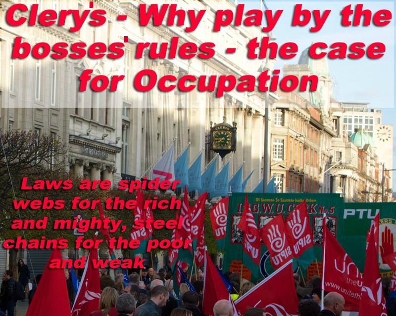 Fridays shock closure of the iconic Clery’s department store in Dublin shows how the law is set up to favour capital and screw workers. Workers are being told there may be no additional redundancy or owed holiday payments as the company is in debt. But this is only the case because right before the closure the largest asset, the building itself, was separated off from the accumulated debts. This was almost certainly legal under our system but of such obvious dubious morality that the workers could expect massive popular support if they occupied the building on a permanent ongoing basis.