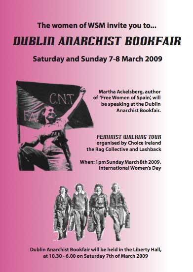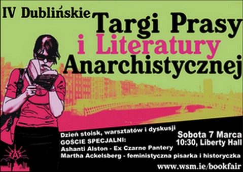 The Workers Solidarity Movement proudly presents the 4th annual Anarchist Bookfair which will take place on weekend of the 7th of March in Liberty Hall. The Bookfair this will host workshops, stalls from campaigning groups and book stalls. For more details see http://www.wsm.ie/bookfair Contact the bookfair co-ordinators at anarchistbookfair2009@gmail.com