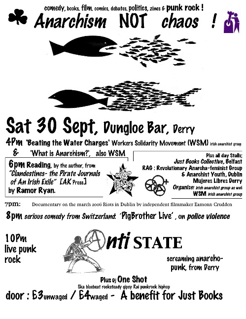 A day of activities this Saturday 30th September in the Dungloe. It will include public meetings, a film on the Dublin riots, a book reading stalls and a gig. Come along and meet fellow anarchists and radicals.