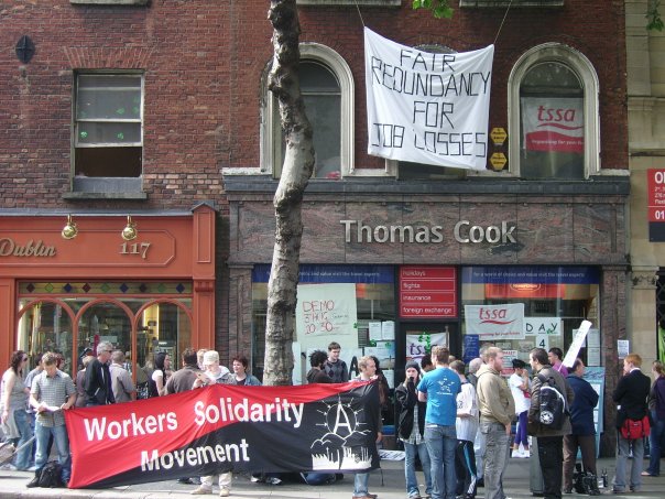 Written at the start ofthe struggle - In a bid to close its outlets in Ireland, the Thomas Cook travel agents has begun by attempting to sack 44 workers at its two offices located on North Earl St. and Grafton St. in Dublin’s city centre.