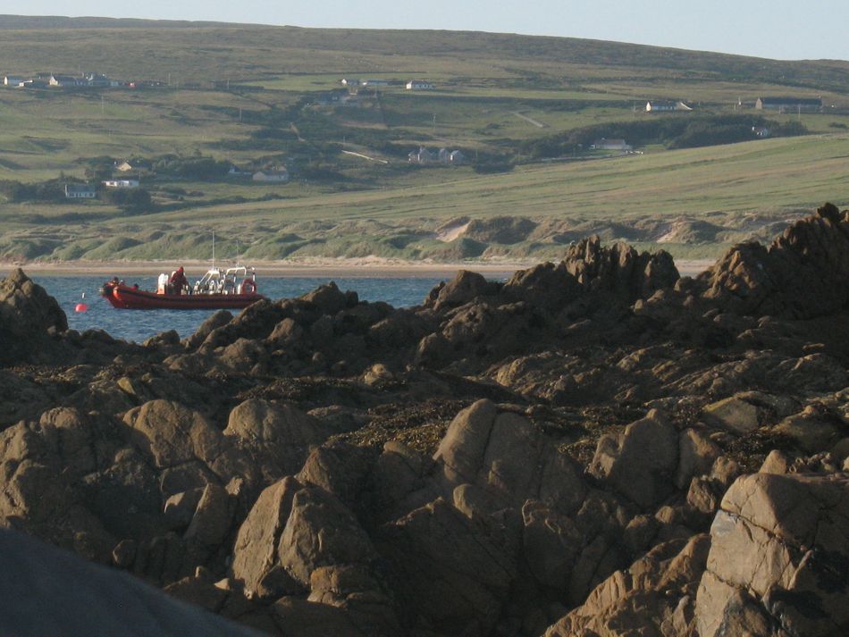 The tidal zone below the camp is full of jagged rocks but once you get past these there was a ring of fast inflatable boats on station with either Gardaí or private security in them, watching us, day and night. Further out are large motor launches with the two dredgers and further out again the gunships of the Irish Navy. The field the camp is in slopes down to the cliff which means almost every inch of it is visible to the crews of the watching boats. It is initially a strange feeling to be sitting around eating dinner with old friends while constantly being watched by these hostile forces. As the sun sets they turn on lights and the whole night long the view to sea is one of bobbing lights on the smaller boats and brilliant arrays of light from the dredgers and way out to sea the Solitaire. A strange backdrop as we share a few cans and a bottle of wine around the campfire or as others played games of hurley or baseball.