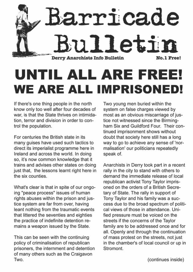 This is the first of issue of Barricade Bulletin, news sheet of the Derry Anarchists. It is our intension to issue this free news sheet every two months locally to help generate anarchist info and knowledge of class struggle anarchism to a wider audience beyond the boundaries and limitations of the internet.