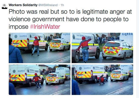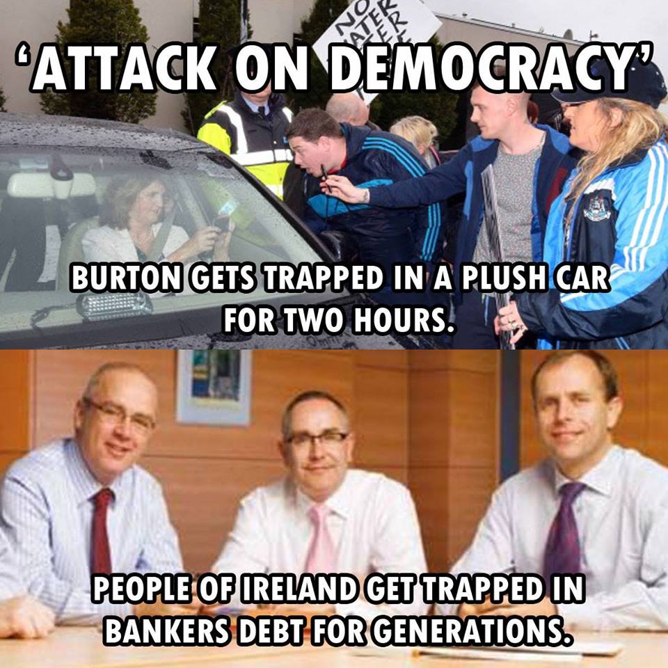 After weeks of Garda provocation, and just after Garda beat protesters with batons someone finally snapped and threw a single brick back. When a politician as unpopular as Joan Burton uses dozens of riot police to force her way into and out of one of the most deprived communities in the state, what should be expected but angry protest. And when at a moment of unprecedented popular mobilisation those same Garda pull pepper spray & batons for use against water charge resistors what is a single brick bouncing off a car in response.
