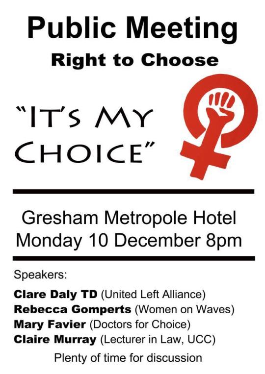 Monday night saw a packed attendance for the 'It's My Choice' meeting in the Metropole Hotel, Cork City. The meeting, billed as an explicitly pro-choice public event, featured three speakers, United Left Alliance TD, Clare Daly, UCC Law lecturer, Claire Murray, and Dr. Mary Favier of Doctors for Choice. Unfortunately, a fourth speaker, Rebecca Gomperts, an activist with the Women on Waves organisation, was unable to attend