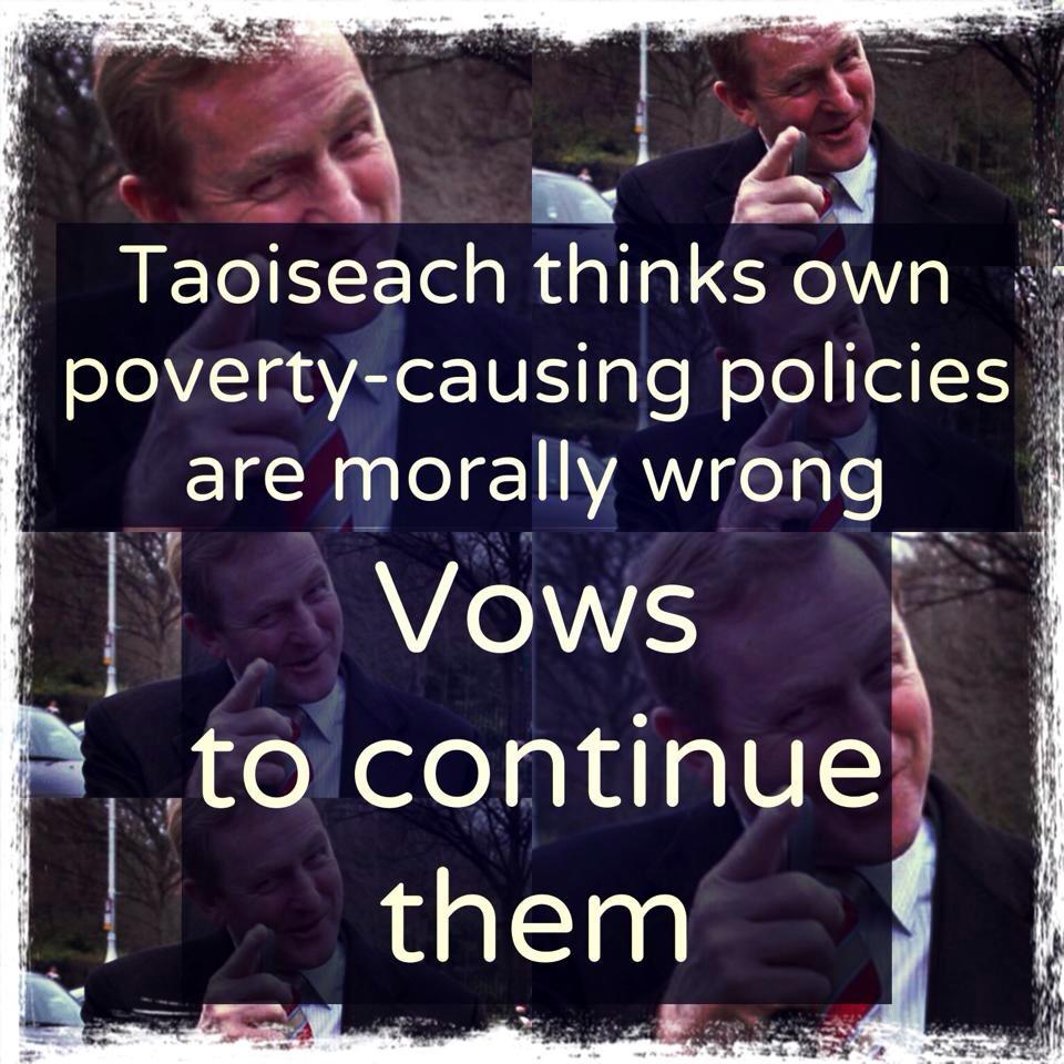 It is also noteworthy that Enda only thinks it’s morally wrong for those in paid employment to experience poverty, and it is quite clear from looking at government policy over the last four years, that this is the consensus amongst the cabinet. You only have value if you are making a profit for someone else or if you are working to ensure the cogs of government keep turning – though, not that much value.