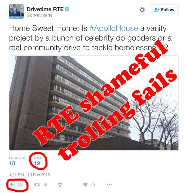 RTE Drivetime engaged in some shameful clickbait trolling on Twitter last night to try and get a few more listeners. While they have congratulated posh schools for engaging in token sleep outs they decided to directly attack the occupation of Apollo house and its bringing into use as an emergency shelter for homeless people.