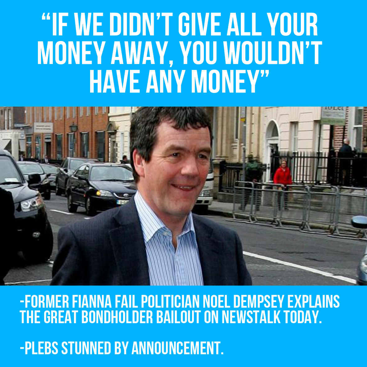 We're paraphrasing but that's the argument put forward by a veteran member of everyone's favourite gombeen party, Fianna Fail.In a debate with TD Paul Murphy on Newstalk's 'The Right Hook' earlier Noel managed to articulate the truly astounding narrative that if Fianna Fail, and the political remora fish that is the Green Party, had not gifted tens of billions of our taxes to secured and unsecured bondholders, we wouldn't have any money in our bank accounts.