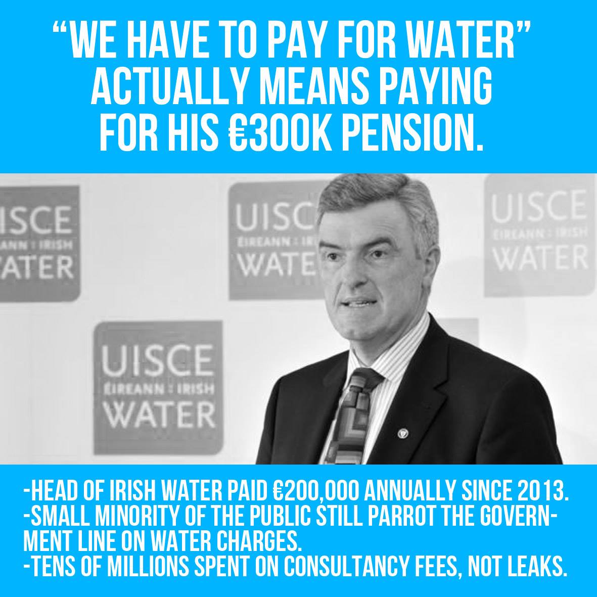 Even at this late stage in the game, water charge campaigners still come across the odd person on the street who will parrot the government propaganda line "We have to pay for water". Of course, this line is nonsense as we already pay for our water through general taxation and paying extra billions to an utter failure like Irish Water, which they'll just waste on consultants fees, is lunacy.