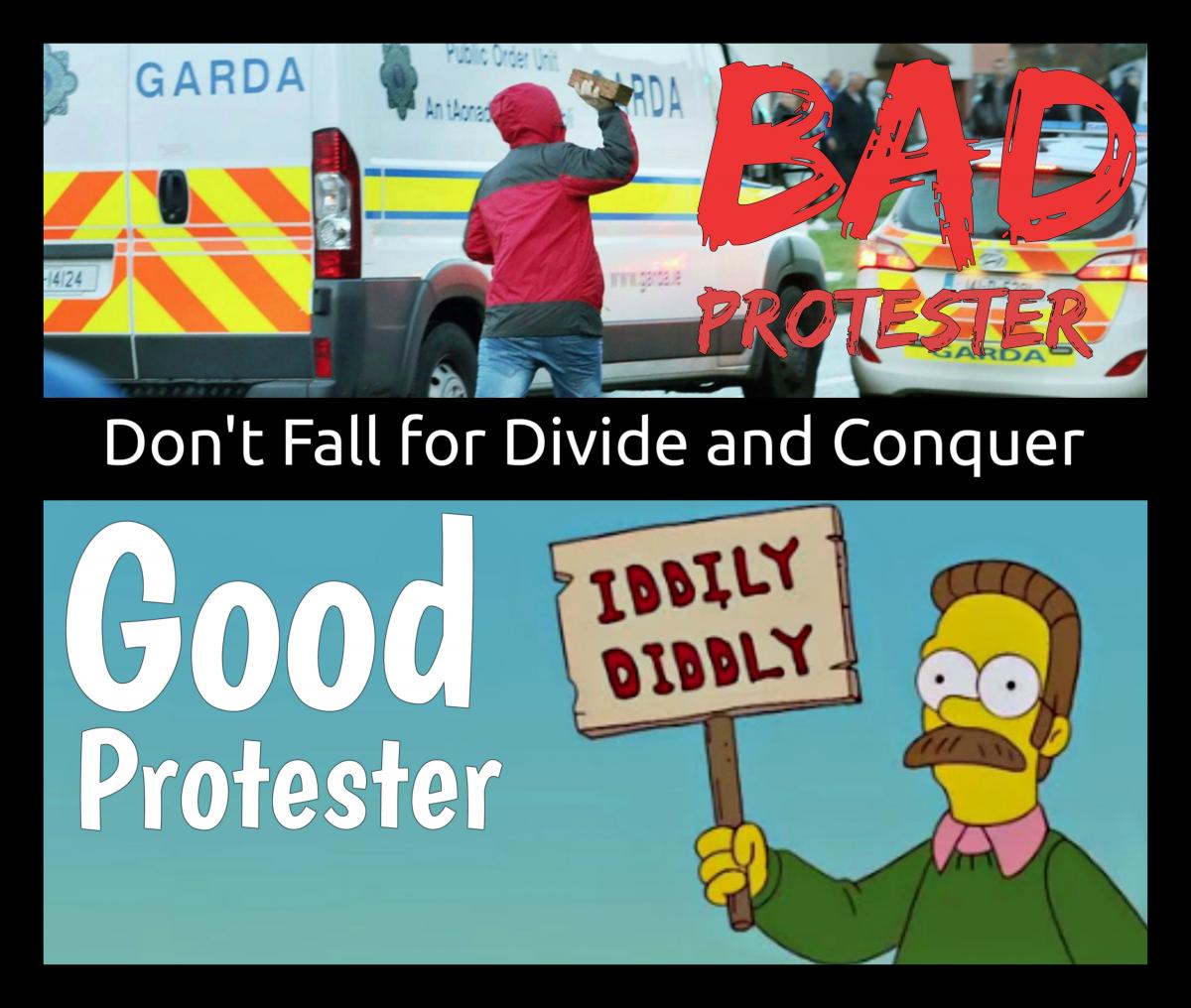 The farce that is the Jobstown [1] trial has mostly been a back and forth about what kind of protest is acceptable and right. Did the people of Jobstown keep Joan Burton and her assistant waiting for too long? Were they too foul mouthed? Too angry? Did they bang on the car too much? What about kids throwing water balloons? The infamous Jobstown brick? Maybe we should put them in prison then. At the heart of this argument is a very important notion: splitting people into 'Good Protesters' and 'Bad Protesters'. This article lays out exactly how that works, and how we should counter this divide and conquer tactic.