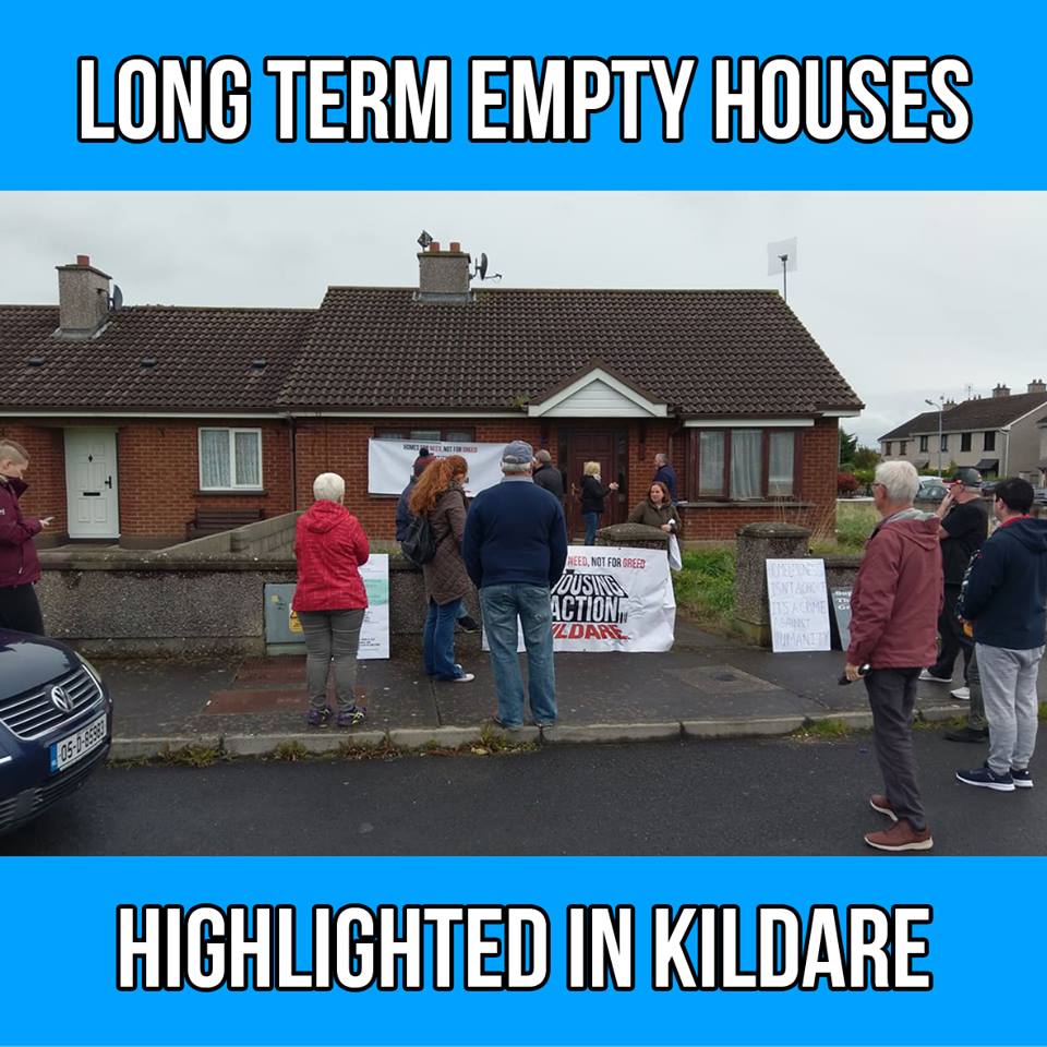 As part of the Take Back the City National Day of Action, housing activists with Housing Action Kildare had a banner and leaflet drop in Newbridge on Sept 22nd, centred around a 4 bedroom house that has been empty for up to 7 years and is owned by a bank.