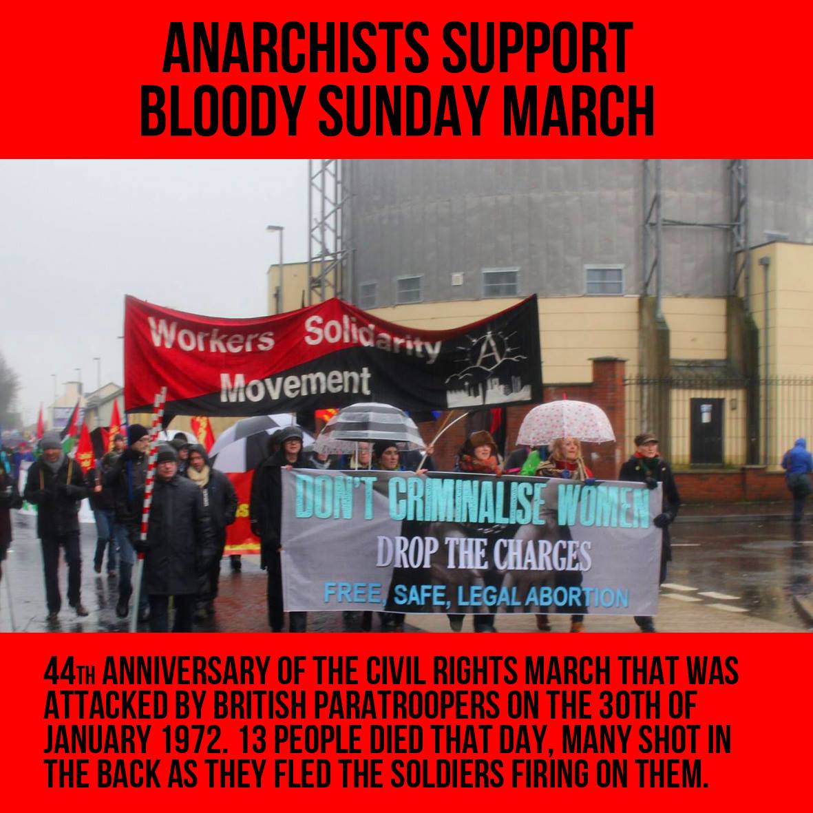 On Sunday, a group of WSM and other anarchists took part in the annual March for Justice in Derry which commemorates the civil rights marchers who were shot dead by the British Parachute Regiment on 30 January 1972.