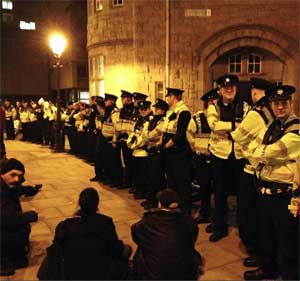Over 150 people gathered at the Central Bank last night in the aftermath of the eviction of Occupy Dame Street (ODS). They then marched to Pearse street Garda station to demand the return of confiscated property but for unknown reasons the Garda prevented them for reaching the station, knocking many to the ground while doing so. Following on from the violence used during the 4am eviction that morning this represents a radical departure from the 'softly-softly' policing that has characterized the interactions of the state with ODS to date.