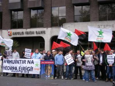 About 100 people were gathered outside this infamous bank, Anglo Irish Bank, on St. Stephens green by the time I'd arrived. I had already been informed of the fact that 7 members of Eirigi had been arrested after occupying the building from early morning. The Gardai had sprung into action and decided to clear out the occupation and they'd done that with the brute force that's become a bit of a speciality over the last few years.