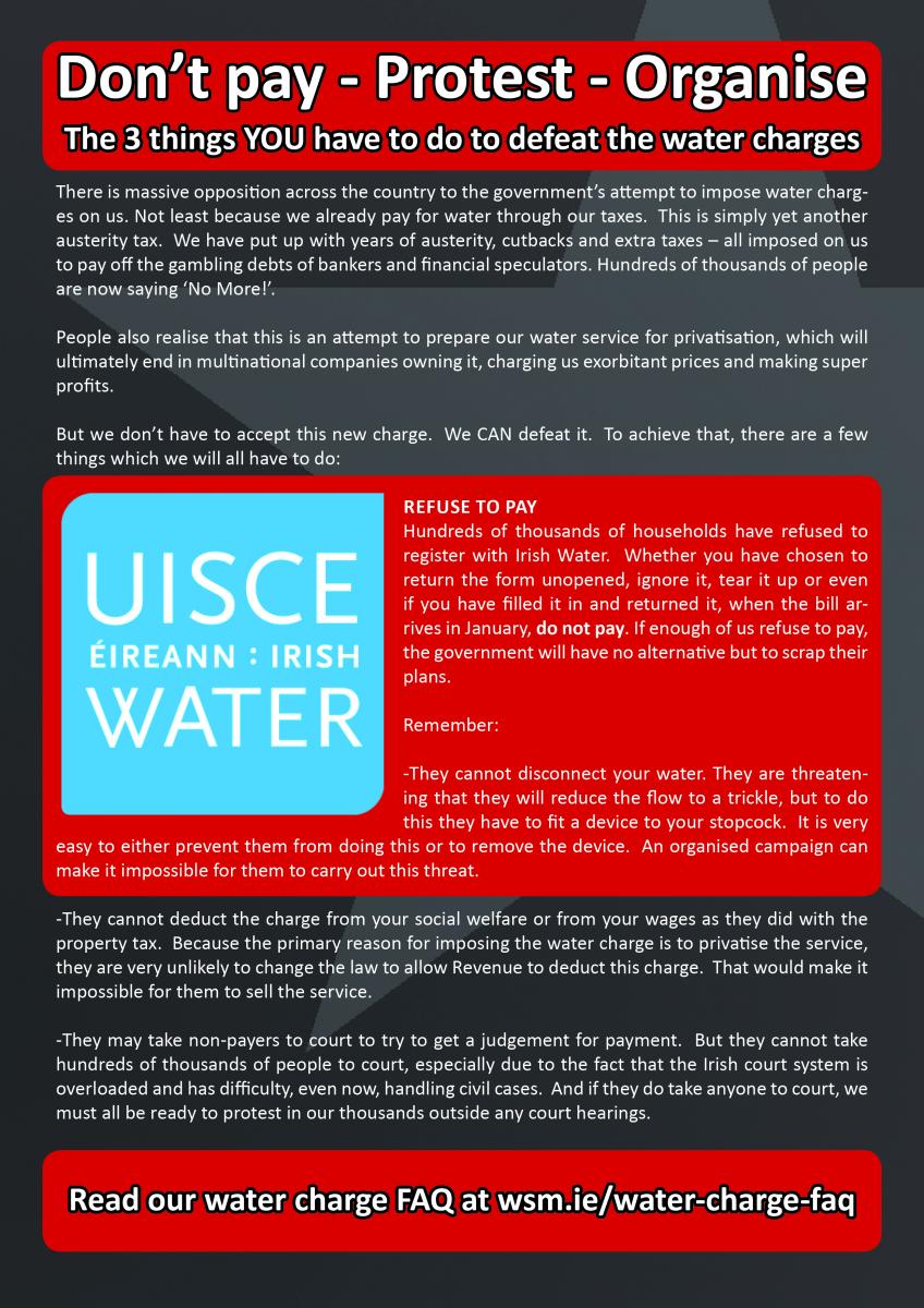 There is massive opposition across the country to the government’s attempt to impose water charges on us. Not least because we already pay for water through our taxes. This is simply yet another austerity tax. We have put up with years of austerity, cutbacks and extra taxes – all imposed on us to pay off the gambling debts of bankers and financial speculators. Hundreds of thousands of people are now saying ‘No More!’.