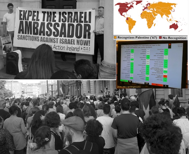 People in Ireland have been protesting the Israeli assault on Gaza in every city and many towns across the country. Online polls show a majority want the government to take action through expelling the Israeli ambassador. Yet the southern government abstained on a crucial UN vote to set up an investigation into Israeli war crimes. We’d suggest when you include a look at the map above it becomes very clear that this is yet another example of the Irish state putting its alliance with the imperialist countries that have imprisoned the majority of the worlds population in misery ahead of the wishes of the population.