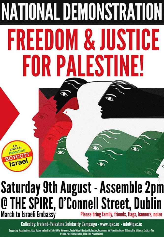 We believe it is time for us all to get together, so the Ireland-Palestine Solidarity Campaign is calling for a NATIONAL DEMONSTRATION in Dublin on Saturday 9th August, assembling at 2pm at The Spire, O’Connell Street. From there we will be marching to the Israeli Embassy.