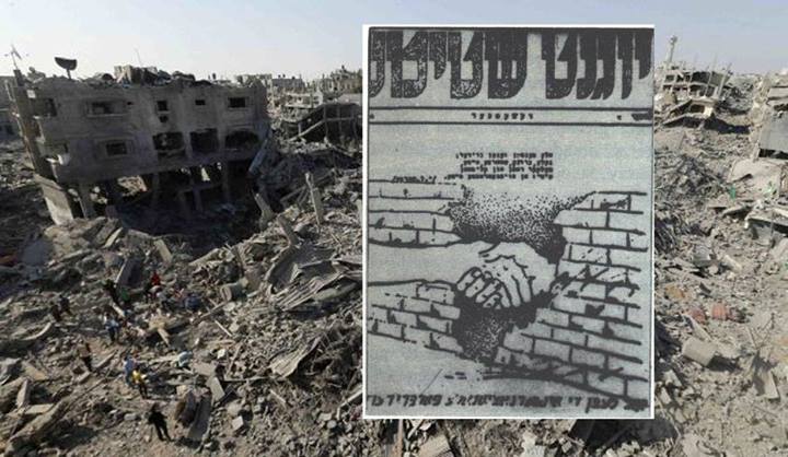 The text below is translated from the poster at the centre of this image of the destruction of Gaza by the Israeli state. But it refers not to this horror but another in 1943 when the Nazis crushed the Warsaw ghetto, wiping out the poorly armed organised resistance that operated out of a warren of bunkers & sewers hidden beneath the ghetto. This poster was by one of the armed factions that defended the Ghetto, the Jewish Combat Organization (ZOB)