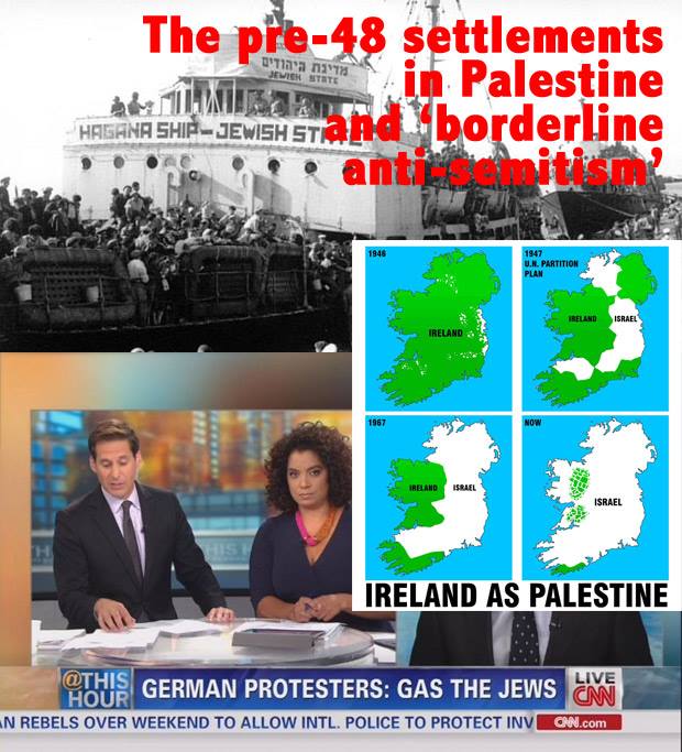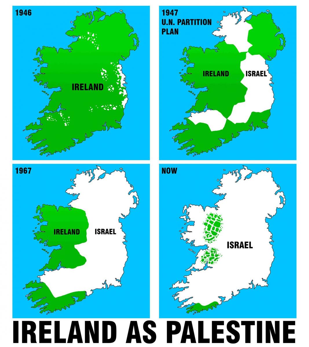 For the size of its population Ireland has seen very large Gaza solidarity demonstrations. It is also one of the few places in the world outside the USA where there has been public displays of support for the Israeli military assault. Internationally there are many variations of this map where activists present to their population what the expulsion of the Palestinians from much of the land they once occupied would look like in a local context. One of our members prepared this but we soon realised its an impossible image to post without some reflection on our own settler colonialist past.