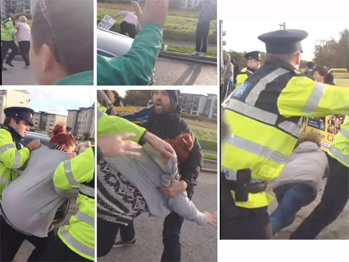 These images are from the video at the link which shows why the campaigners became so outraged. As Enda Kenny drove through the crowd (flashing a dismissive thumbs up sign at the protesters) Garda were assaulting them and throwing them to the ground.