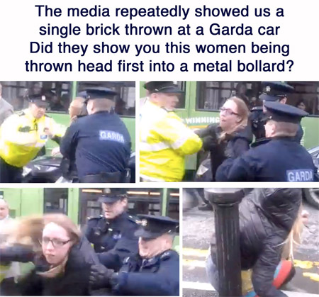 Then on Sunday as Enda Kenny drove out of the Mansion house three Garda grabbed Fiona who was protesting there and threw her head first into a metal bollard at the side of the road. In the video of the incident you can hear a sickening thud as she hits the bollard but you can also see the considerable force put into throwing her. But don't expect a media outcry about the violence of 3 large men smashing a women's head* off a metal pole, instead expect to hear once more about that brick that bounced off the back of a car.