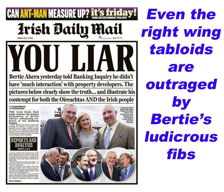 Bertie's 'testimony' to the banking enquiry could hardly have provided a better example of the way politicians in this country understand they are protected from any consequences of their wrongdoing. Apparently we are to believe that he hardly knew any developers. Even the Mail is outraged, but what will be done about it?