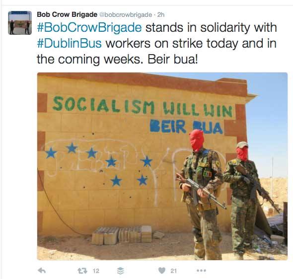 The Bob Crow Brigade fighting ISIS and defending the Rojava revolution took time out recently to post images supporting Repeal the 8th and the Dublin bus strikers. The photos of masked people men & women with guns posing in the sand beside placards with slogan about our struggles in Ireland caused some confusion, some even assumed they had to be photoshopped. The above image is a variation on the one they tweeted.