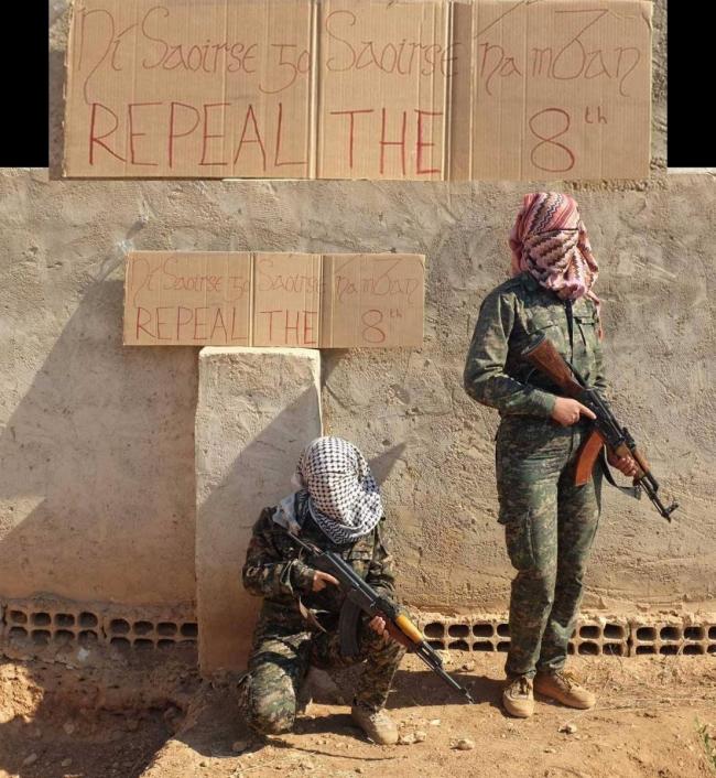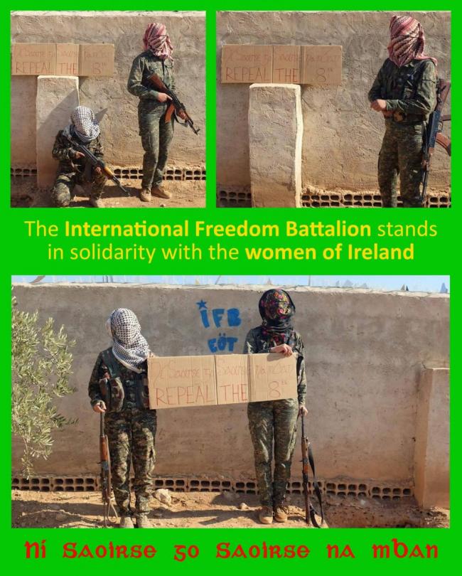 Last week we were blown away by the amazing level of solidarity that was offered to those of us who are working tremendously hard to introduce free, safe, legal abortion in Ireland when a photo emerged on twitter of two members of the International Freedom Battalion in Rojava next to a sign that said “Ní saoirse go saoirse na mban” (Until the women are free none are free) and “Repeal the 8th”.