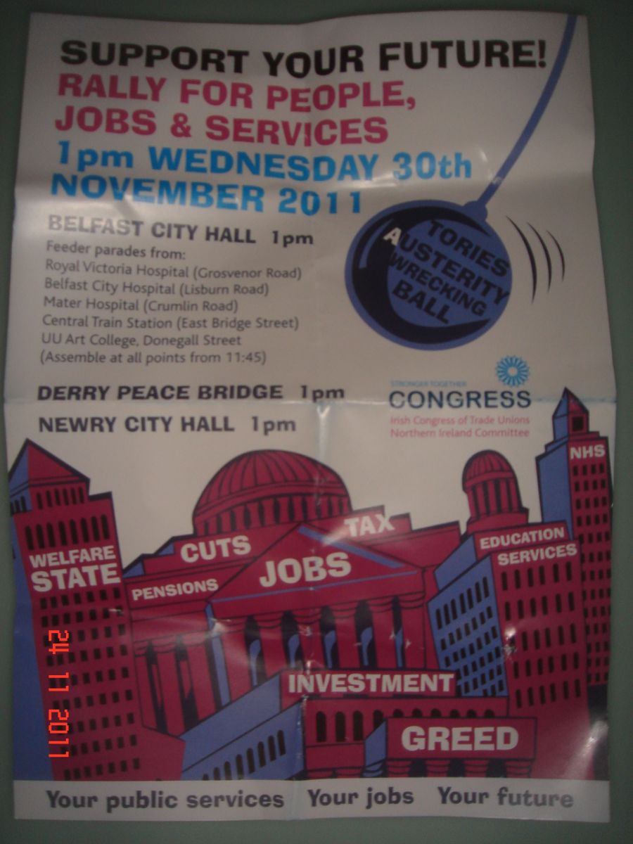 Millions of public sector workers will be taking to the picket lines across the UK including tens of thousands in the North on the 30th November against the latest Government austerity measures that seek tol force workers to work for longer for less. All the mainstream unions from NIPSA, Unison to GMB have successfully balloted their members, from teachers & council workers to bus drivers for the co-ordinated industrial action against the proposed new pension scheme. The scheme which will see people who day in, day out, care for our young, our frail, our elderly, our homes, streets and parks; the people who, after decades of service, be lucky to have £5,600 per year to live on when they retire.