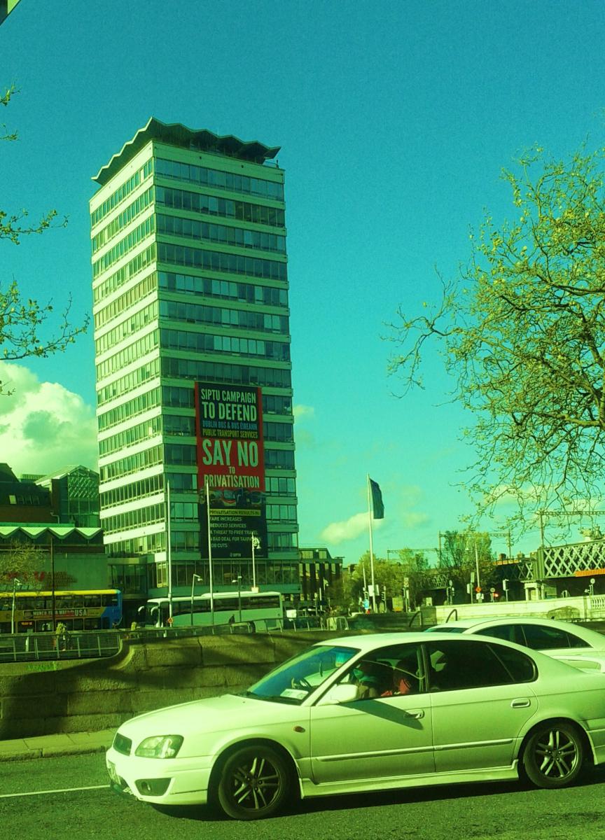 Could climate change become a catalysing force for radical social transformation in Ireland? Recent struggles around public transport in Ireland prompted me to think along these lines. Last weekend, Dublin Bus and Bus Éireann workers went on strike over plans by the National Transport Authority to tender out 10% of public routes to private operators. A few days earlier, SIPTU’s banner at Liberty Hall had been unfurled to state: ‘Say No to Privatisation; privatisation results in fare increase, reduced services, a threat to free travel, a bad deal for taxpayers and job cuts’. SIPTU and NBRU members and strike organisers have emphasised the damage privatisation will do to society, primarily concentrating on the loss of community services and the race to the bottom in bus drivers’ terms and conditions [1]. The striking workers deserve our support and their claims should be taken seriously. This is definitely the case when the regime media adhere to a deeply unimaginative line, loudly declaiming traffic disruption to an imagined city of angry consumers and silently accepting the hollowing out of public services [2]. At the same time, however, we also need to think about what’s not being said, about the words that don’t make it on to the papers or the banner.