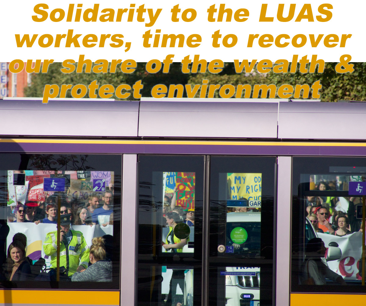 Our solidarity today to the LUAS workers striking for decent pay rates. The crisis was used by the government and capitalist class to drive down wages and ensure that a bigger share of profits went to shareholders. The LUAS fight is a fight for all of us as a victory should be a green light to all workers to demand pay rises, including the recovery of the money lost in the cuts imposed under the crisis. Across the world the share of income that goes to the richest 1% has soared while that going tooth rest of us has been slashed, we need to fight to reverse this.