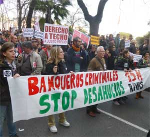 Following on from a very large anti-eviction march of 10's of thousands in Madrid on Saturday today, 22 February, 2013, over 100 neighbors, anti-foreclosure activists, and 15M organizers stood together to prevent Nieves and her children (ages 6 and 9) from being evicted from their apartment. Although they have lived in their apartment for years, Nieves’ ex-husband’s parents are trying to force out their grandchildren so that their son (Nieves’ ex-husband) and his new family can live there. Her ex-husband has faced charges of domestic abuse and there is currently a restraining order against him legally preventing him from having anything to do with his children. He has also failed to pay child support on numerous occasions.