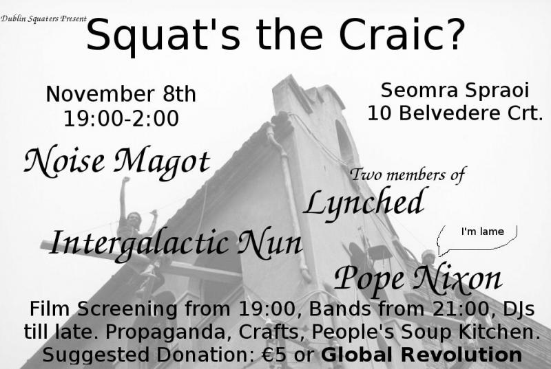 According to the organisers: "This event will be an opportunity for people to come along and enjoy an evening full of propaganda, crafts, food from The People's Soup Kitchen and the launch of a new zine based on the experiences of squatters. It would be a good time to meet up and keep up with what's been going on in Dublin and a chance to get informed about the last threat of eviction and discover how you can get involved with and support squatting in Dublin!"