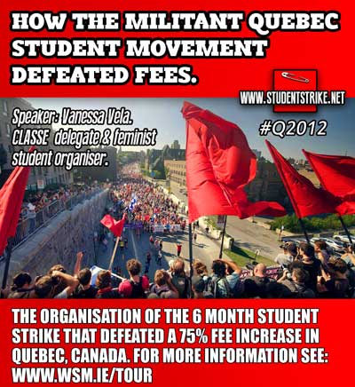 In 2012 the attempt by the government to Quebec to introduce a 75% fee hike was defeated by the organisation of a mass student strike that lasted over 6 months. That fee increase was part of the global process of imposing the privatisation and commodification of education. Since the victory, organisers of the strike have been being doing speaking tours to aid the process whereby "youth and students everywhere are becoming increasingly conscious of the need to organize as a means to defend education as a social right". In September this tour reaches Ireland where we need to hear how a sustained and militant student movement that can win is built.