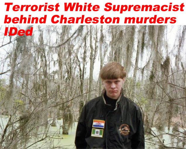 The terrorist white supremacist suspect behind the Charleston murders has been identified as Dylann Roof, a 21-year-old from Lexington County, S.C. In this photo he is wearing the apartheid-era South African flag and the flag of the racist Rhodesian state on his jacket. Another photos shows that his car had a 'Confederate States of America' racist flag license plate.