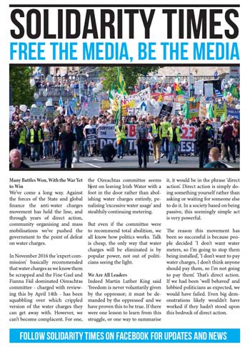 The Workers Solidarity Movement have called an anarchist/anti-authoritarian bloc to join the Water Charges march Saturday 8th April in Dublin. This bloc will meet at Connolly Station at 2pm . Look out for the red and black flags. We will be handing out several hundred copies of this 4-page leaflet produced by the WSM, which includes content on the water charges, housing, and the pro-choice struggle, and are looking for folks to help us distribute these on the day. [PDF to download]