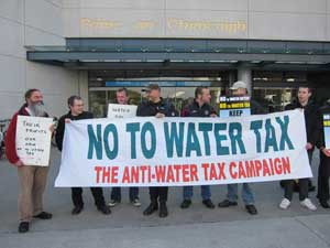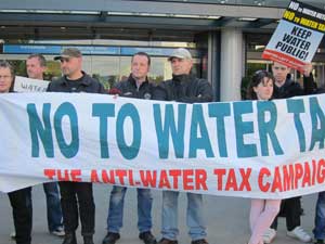 40 members of the new Anti-Water Tax Campaign from Waterford, Cork and Dublin protested outside the Green Party conference last weekend. John Gormley and his fellow Green TDs have been leading the charge to impose this additional charge on households, pretending a regressive tax is somehow an environmental measure.