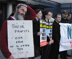 Around 60 anti-water tax campaigners placed a picket on the water metering conference at Croke Park this morning. Such a large turnout at 8.30 am must have caused concern for the attending companies who view the government plan to charge for and meter water as an easy way for them to make a fast buck. It has been announced that 600 million euro is to be spent imposing the plan. It's fast becoming clear that the introduction of water charges will face serious resistance and those attending must be aware that the previous attempt to impose a water tax was defeated by such mass resistance in the 1990's.